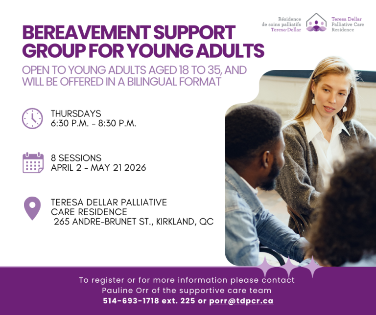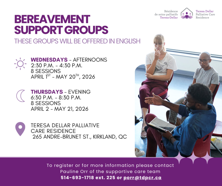 Our bereavement groups are offered several times a year at the Residence and are divided by age group and language (English or French). They may also be held online when required. All sessions are offered free of charge.